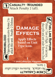If the attack is a hit, the Intensity of that attack (representing how well-placed the shot was) is determined with a d10, which is added to the base damage factor of the weapon that scored the hit. The defense value of the target is subtracted from the total damage and what is left is applied to the target's Endurance. Each unit has an amount of damage that it can sustain and if the break number is reached (normally half of the full Endurance) a Damage Card is drawn and the extra effects are applied to the target.
